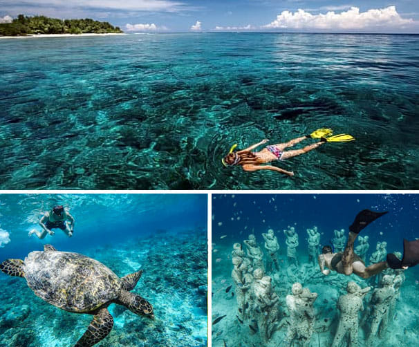 The idyllic beaches, palm forests, and coral reefs of the Gili Islands lie just off the northwest coast of Lombok Island. On this Public Snorkeling Trip, visit two islands in half day and cruise between the islands on a glass-bottomed boat. Public Share tour: visit 2 islands without feeling rushed Snorkel at two different sites: a coral reef and a shipwreck Spot tropical fish and marine life on-board a glass-bottomed boat